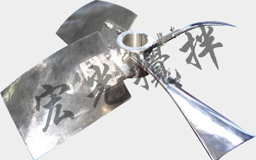 外緣的圓周速度一般為5~15m/s。旋槳式攪拌器主要造成軸 向液流,產生較大的循環量,適用于攪拌低粘度(<2Pa·s)液體、乳濁液及固體微粒含量低于10%的懸浮液。攪拌器的轉軸也可水平或斜向插入槽內,此時液流的循環回路不對稱,可增加湍動,防止液面凹陷。